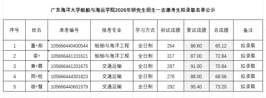根据教育部及成人视频 2026年硕士研究生招生录取相关文件要求,经成人视频 研究生招生录取工作领导小组审核确定,现将我院2026年硕士研究生第一志愿考生拟录取名单予以公示(详见附件)